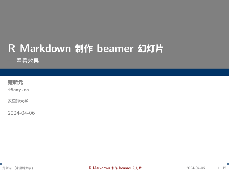 这篇文章主要参考了黄湘云发表在统计之都上的文章R Markdown 制作 beamer 幻灯片,非常良心的一篇文章,我非常佩服他的耐心和严谨以及精益求精、求真务实的态度。这里分享一个拿来即用的模板,方便后期做 beamer 幻灯片使用。再次感谢湘云。